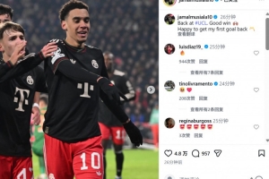 本場比賽穆西亞拉破門,賽后他也在個人社媒曬出本場照片,配文寫道:“回到歐冠取得很棒的勝利,很高興能夠收獲回歸以來的首粒進球?!?/p>