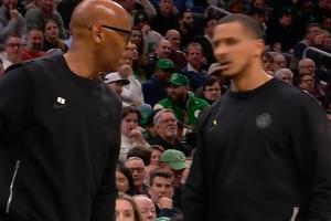 GIF-馬祖拉吃T后怒噴裁判!助教卡塞爾來勸他,結果被馬祖拉一把摔到一邊 ,馬祖拉繼續追著裁判罵!