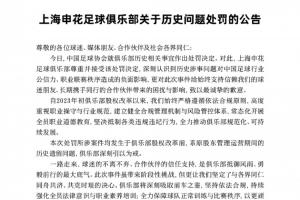 上海申花官方發(fā)布《關(guān)于歷史問題處罰的公告》,表示尊重并接受該處罰決定,向球迷和合作伙伴致以最誠摯的歉意。