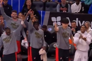 首節比賽,開拓者中鋒羅伯特·威廉姆斯飚中生涯第二記三分,楊瀚森與替補席的隊友們開心慶祝。