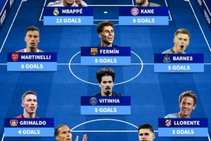 前鋒:姆巴佩(皇馬,13球)、凱恩(拜仁,8球)