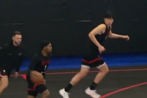 視頻當中,楊瀚森接球上籃打進,開拓者眾將輕松備戰氛圍融洽。