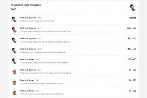 決勝盤第8局德約0-40后,連拿5分最終保發。5-3領先辛納
