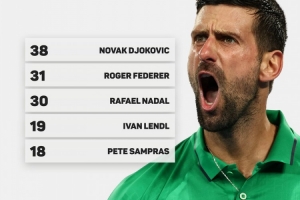 體育資訊1月30日訊 數據顯示,德約科維奇在公開賽年代38次闖入大滿貫男單決賽,位列歷史第一。