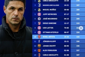 體育資訊1月31日訊 阿森納主帥阿爾特塔在英超中已經(jīng)拿到了200勝,德國轉(zhuǎn)會市場盤點了五大聯(lián)賽主帥單一俱樂部達成200勝所用場次情況,瓜迪奧拉268場最少,阿爾特塔325場躋身前10,所用場次少于克洛普。