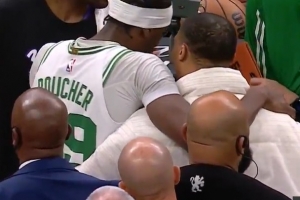 GIF-布歇壓哨扔進三分,威少不滿差點沖突,隨后雙方解釋互相友好退場