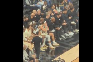 灣區媒體95.7 The Game曬出庫里在場邊的畫面,當時庫里沮喪地拍了拍大腿,隨后一瘸一拐走回更衣室。