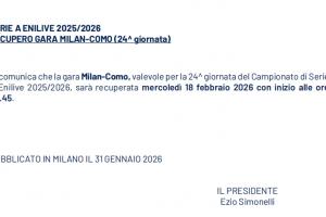 體育資訊1月31日訊 據意甲聯賽官網的消息,AC米蘭主場與科莫的補賽時間確定,將在北京時間2月19日03:45進行。