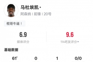 馬杜埃凱本場比賽數(shù)據(jù)如下: