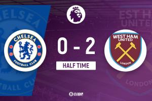 上半場傷停補時5分鐘,半場結束,切爾西暫0-2西漢姆聯。