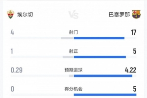 體育資訊2月1日訊 本輪西甲,巴薩半場2-1領先埃爾切。雙方半場重點數據對比如下↓(主隊埃爾切在前)