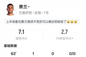 體育資訊2月1日訊 西甲第22輪,巴薩客戰埃爾切。費蘭·托雷斯首發出戰,打進1球,1次過人成功,但3次錯失進球機會,2次射中門框,評分7.1。