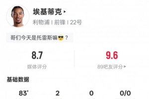 體育資訊2月1日訊 英超第24輪,利物浦主場迎戰紐卡斯爾。埃基蒂克首發出戰,6次射門4次射正,貢獻雙響,也錯失2次進球機會,評分8.7。