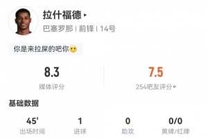 體育資訊2月1日訊 本輪西甲,巴薩3-1客勝埃爾切。此役拉什福德替補出場45分鐘,球員全場重點數據如下↓