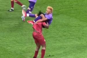 兩名球員在球場邊突然上演摔跤比賽,雙方更是使出WWE摔跤動作,只見一方用“奪命剪刀腳”撂倒另一方,最后更是有球員上來扮演裁判為他們拍地板讀秒!