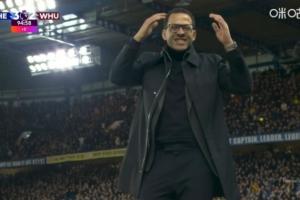英超第24輪,切爾西3-2西漢姆聯。比賽補時階段,帕爾默攻門打出超級超級離譜沖天炮,羅塞尼爾抱頭戴上痛苦面具。