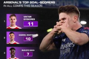 阿森納本輪英超4-0客勝利茲聯,目前槍手本賽季的隊內各項賽事射手榜情況如下: