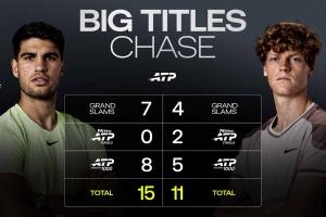 阿爾卡拉斯與辛納重大賽事冠軍數(shù)↓