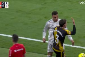 羅德里戈被推倒后,姆巴佩迅速上前為隊友出頭,與查瓦利亞對峙。
