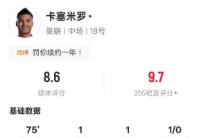 體育資訊2月1日訊 英超第24輪,曼聯主場迎戰富勒姆,卡塞米羅首發出戰,傳射建功,還有1次關鍵傳球,另外他在防守端還有3次解圍和3次搶斷,評分8.6。