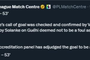 裁判的進(jìn)球判罰經(jīng)過VAR檢查和確認(rèn),索蘭克對格伊的接觸不構(gòu)成犯規(guī),因為前者碰到了球。進(jìn)球認(rèn)證小組已經(jīng)判定為該進(jìn)球是索蘭克的進(jìn)球。