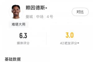 體育資訊02月02日訊 英超第24輪,熱刺主場2-2戰平曼城,本場比賽曼城中場賴因德斯替補出場20分鐘,發揮平平。