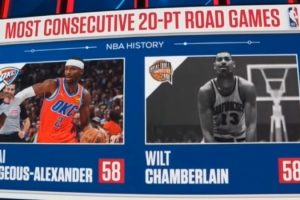 此外,值得注意的是,亞歷山大目前連續(xù)58場客場得分20+,已經(jīng)追平了張伯倫保持的NBA歷史紀(jì)錄!