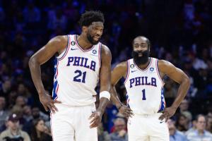 在常規賽賽場上,哈登和恩比德一共對決過10次,兩人各自贏下5次。