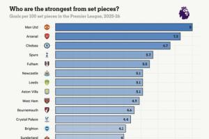 體育資訊02月03日訊 據(jù)TA報道,本賽季至今,曼聯(lián)是英超定位球效率最高的球隊,每100次定位球機會就能打入8球,高于阿森納的7.3球。