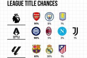 體育資訊02月03日訊 根據(jù)EuroClubIndex的預(yù)測(cè)數(shù)據(jù),五大聯(lián)賽最新奪冠概率如下。
