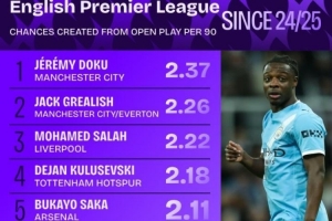 體育資訊2月3日訊 “Squawka”統(tǒng)計了上賽季開始至今,每90分鐘創(chuàng)造運動戰(zhàn)機會最多的前十位英超球員(只統(tǒng)計創(chuàng)造50次機會以上的球員)。曼城邊鋒多庫以場均2.37次領(lǐng)跑榜單。