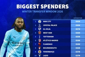 體育資訊2月4日訊 冬季轉(zhuǎn)會窗已經(jīng)關(guān)閉,德國轉(zhuǎn)會市場盤點了足壇各隊引援花費情況,曼城以9500萬歐居首,水晶宮以9000萬歐位居次席。