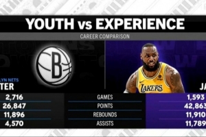 湖人客場挑戰籃網,轉播方曬出籃網全隊和詹姆斯的數據對比,籃網全隊的得分、籃板和助攻之和都沒有詹姆斯的個人數據多。
