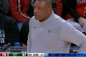 雄鹿上半場領先25分,但下半場被打出27-10,分差縮小至8分了,老里暫停但是沒啥效果。