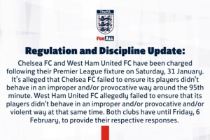 英足總發布監管與紀律更新公告:針對1月31日周六英超聯賽中的行為,切爾西足球俱樂部與西漢姆聯足球俱樂部已遭到指控。