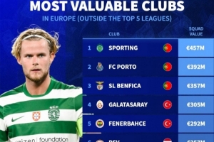 體育資訊11月11日訊 德國轉會市場盤點了五大聯賽之外的歐洲球隊身價,葡萄牙體育4.57億歐元排名第一。