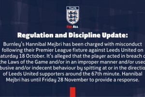 體育資訊11月11日訊 英足總官方消息,伯恩利中場(chǎng)漢尼拔·梅布里因在10月18日對(duì)陣?yán)澛?lián)的英超比賽中不當(dāng)行為而被指控。