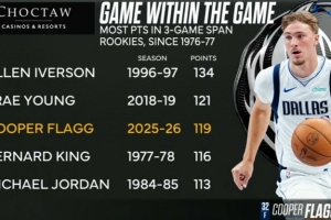 過去三場比賽弗拉格合砍119分,是自76-77賽季新秀連續三場得分之和的第三高,僅次于艾弗森和特雷·楊。
