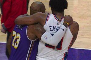 里夫斯沖過來和八村塁相擁~!!!詹姆斯和恩比德也抱在一起~!!!