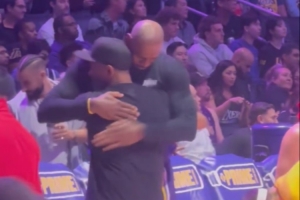 本場比賽,黑人影帝丹澤爾·華盛頓來到現場看球,他還來到詹姆斯身邊,兩人擁抱并寒暄數句。