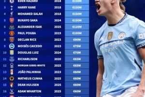 體育資訊11月12日訊 德國轉會市場盤點了英超各隊歷史身價最高球員,哈蘭德以2億歐居首,阿扎爾、凱恩、薩拉赫和薩卡均為1.5億歐。