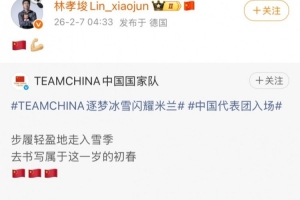 中國短道速滑運(yùn)動員林孝埈在社媒轉(zhuǎn)發(fā)了中國代表團(tuán)現(xiàn)身開幕式的照片,并配上了“??????”的emoji。