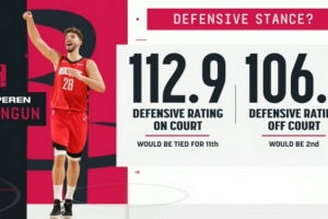 申京在場火箭防守效率(球隊百回合失分)112.9,下場后為106.1