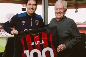 體育資訊2月7日訊 伯恩茅斯俱樂部官推曬圖,主教練伊勞拉收到執(zhí)教球隊(duì)英超百場(chǎng)紀(jì)念球衣。