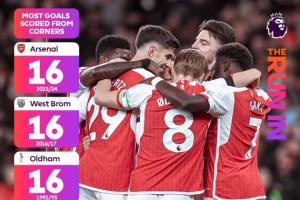 槍手目前距離英超單賽季角球進球最高紀錄只差2球,該紀錄現為16球,由1992-93賽季的奧德漢姆、2016-17賽季的西布朗以及2023-24賽季的阿森納共同保持。