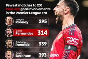 體育資訊2月8日訊 曼聯在本輪英超2-0擊敗熱刺,B費取得進球,也解鎖了為曼聯直接參與200球里程碑。數據統計顯示,他也是英超時代第二快達成此成就的曼聯球員。