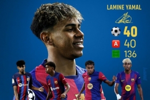 據《世界體育報》統計,18歲亞馬爾為巴薩出戰136場比賽,已貢獻40粒進球和40次助攻。