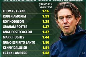 排名低于這些人,或許足以說明弗蘭克的處境。他在熱刺球迷群體中極不受歡迎,而賽程也沒有變得輕松。接下來是紐卡斯爾的到訪,隨后是死敵阿森納。之后還有富勒姆和水晶宮,三月底前還要對陣利物浦和諾丁漢森林,他后續的戰績甚至可能變得更糟。