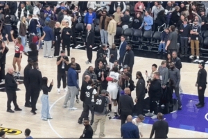賽后,哈登被媒體記者們包圍,他和自己的幾個朋友擁抱致意。