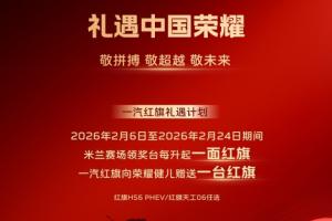 一汽紅旗在宣傳海報(bào)中寫道:米蘭賽場(chǎng)領(lǐng)獎(jiǎng)臺(tái)每升起一面紅旗,一汽紅旗向榮耀健兒贈(zèng)送一臺(tái)紅旗。